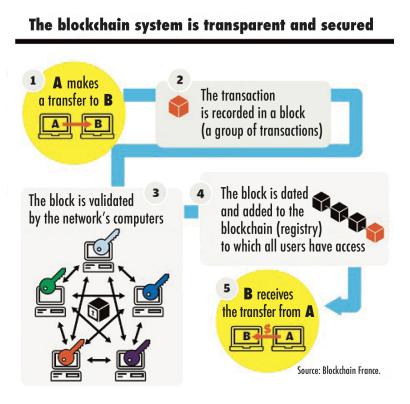 Even though blockchain technology is recent, some applications are already operational. But let’s step back to the outline of this chain of block technology. Since times immemorial, transactions have been recorded on books. Towards the end of the last century, computers allowed the digitalization of documents. But these computerized versions are but, in the end, just the reflection of their paper forebears. With, furthermore, a central decision-making authority tasked with validation. Banks, for instance, are supposed to verify the financial transactions. With Distributed Ledger Technology, or DLT, data are recorded in several places at the same time, without filing of reference data or centralized functions administration. It is a linear chain of blocks, connected and secured by cryptographic proofs. In contrast to a regular registry, the whole is not controlled by one single organization and does not depend on a single database. It’s thus a distributed system (there is no one sole copy of the registry) running like a decentralized registry (there is no unique control authority). Thus, this technology allows the storage and transmittal of data in a transparent, secure manner, without a control body.